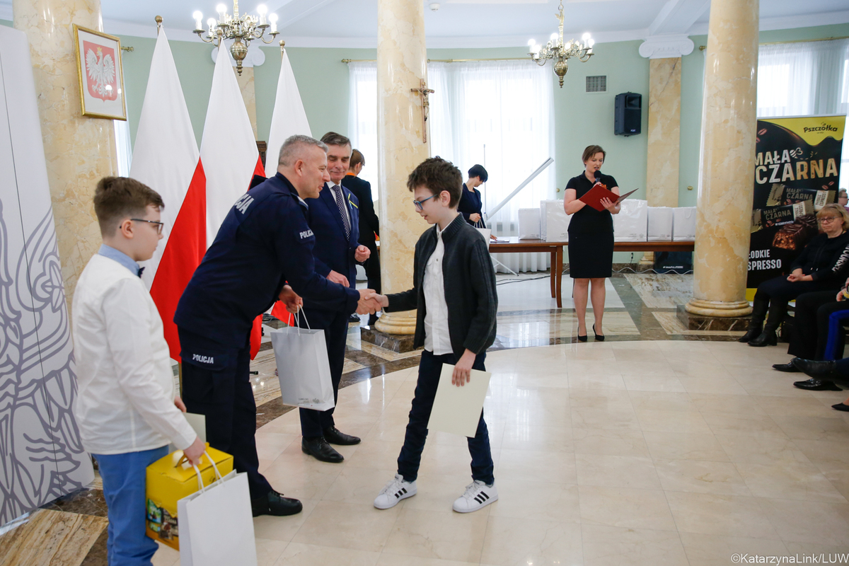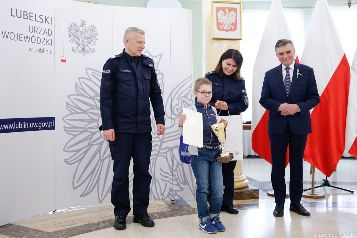 Szef lubelskiego garnizonu Policji nadinspektor Artur Bielecki wręczył dziś uczniowi I klasy szkoły podstawowej w Sielcu - Puchar Komendanta za projekt gry edukacyjnej. To jedna z nagród i wyróżnień podczas dzisiejszej gali dla finalistów konkursu "Widzisz? Reaguj! Dzwoń 112”. W konkursie zorganizowanym przez Wojewodę Lubelskiego Lecha Sprawkę udział wzięło ponad 500 uczniów ze 150 szkół podstawowych i ponadpodstawowych naszego województwa.
