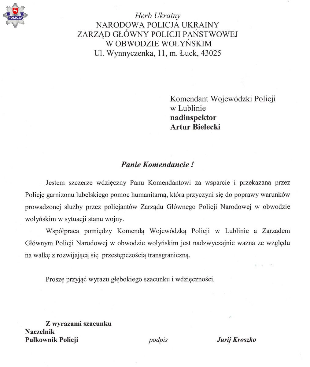 Niedawno list z podziękowaniami od Zarządu Głównego Policji Państwowej w Obwodzie Wołyńskim trafił na ręce nadinspektora Artura Bieleckiego Komendanta Wojewódzkiego Policji w Lublinie. To słowa wdzięczności, których autorem jest Naczelnik Pułkownik Policji Jurij Kroszko. Dziękując za przekazaną pomoc humanitarną, podkreślił, że dzięki temu wsparciu, uległy poprawie warunki służby prowadzonej przez policjantów w sytuacji stanu wojny.