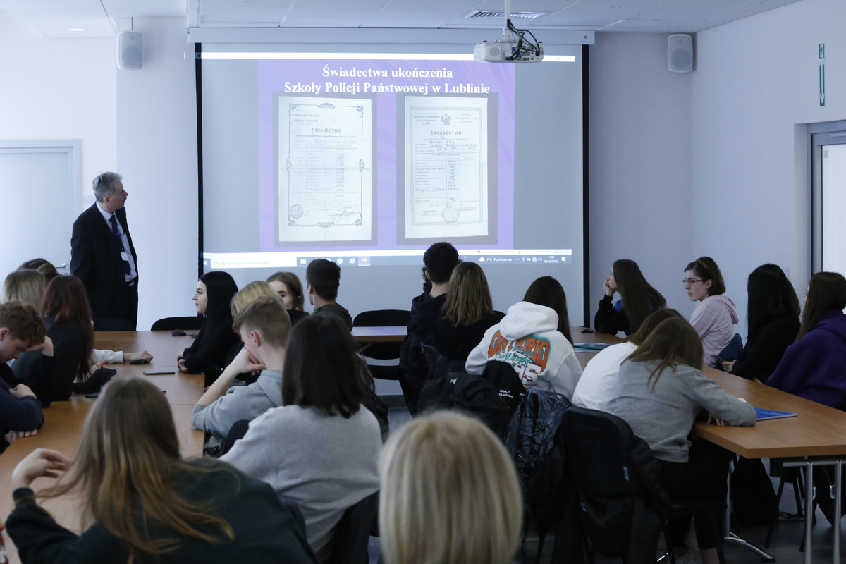 Policyjną Izbę Pamięci odwiedzili wczoraj uczniowie Liceum Ogólnokształcącego (policyjno-prawnego) z Zespołu Szkół Ponadpodstawowych w Niemcach. Prelekcja na temat historii Policji, prezentacja zgromadzonych zbiorów oraz pogadanka profilaktyczna z zakresu prewencji i ruchu drogowego to przygotowane dla uczniów atrakcje.