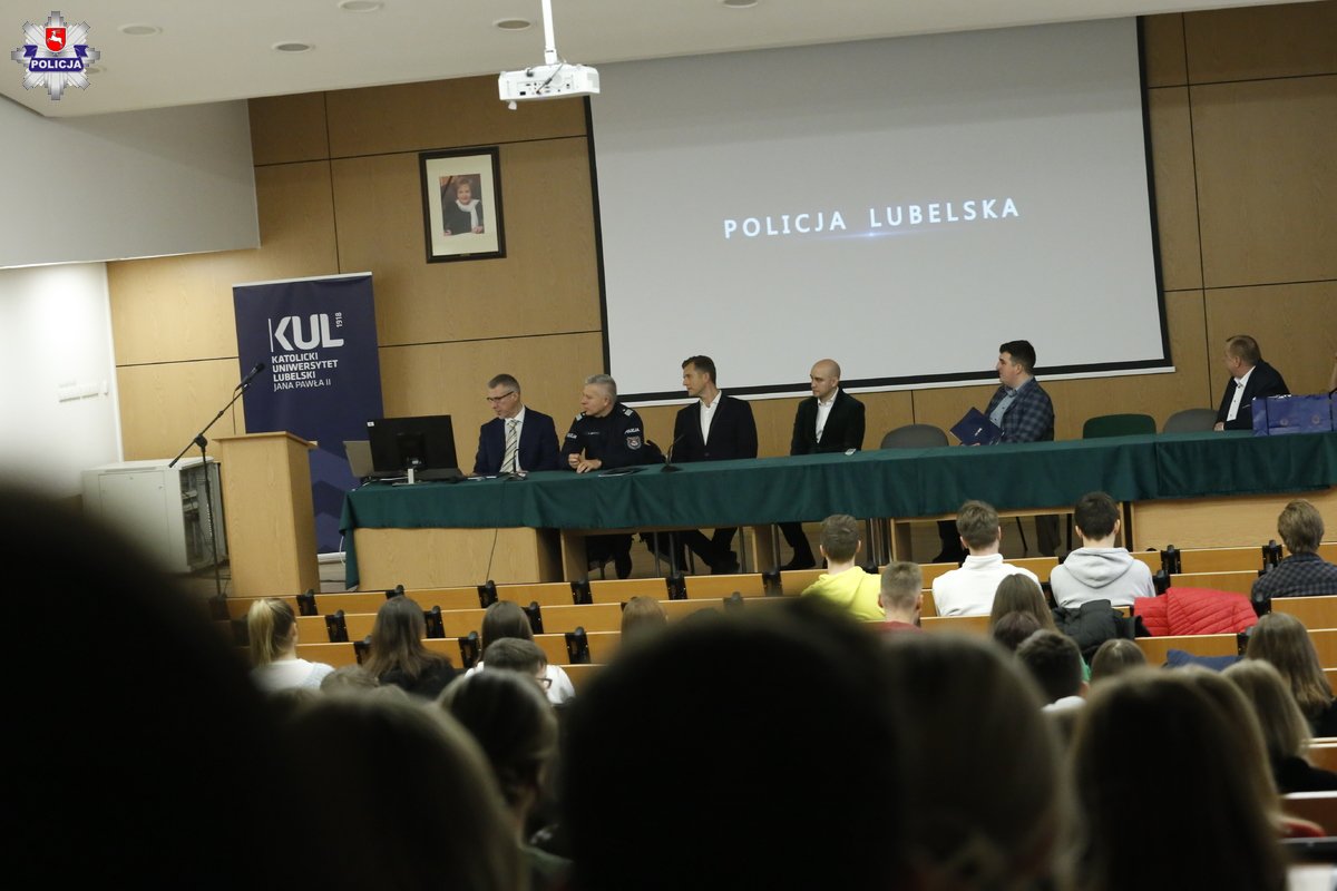 Dzisiaj przygotowano dla słuchaczy wykłady oraz warsztaty na temat policyjnej służby, które prowadzą funkcjonariusze z Komendy Wojewódzkiej Policji w Lublinie oraz Komendy Miejskiej Policji w Lublinie. Podczas otwarcia panelu zebranych na auli studentów przywitał Komendant Wojewódzki Policji w Lublinie nadinspektor Artur Bielecki.