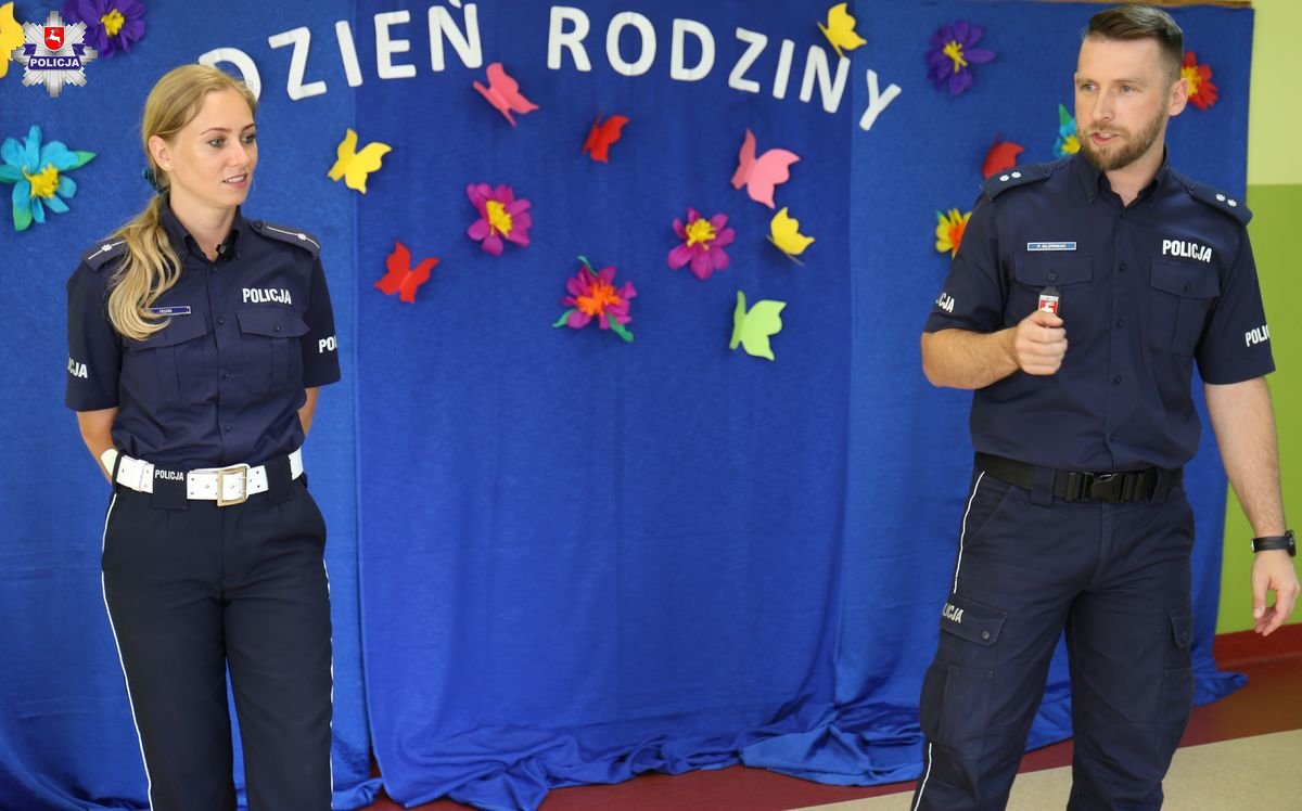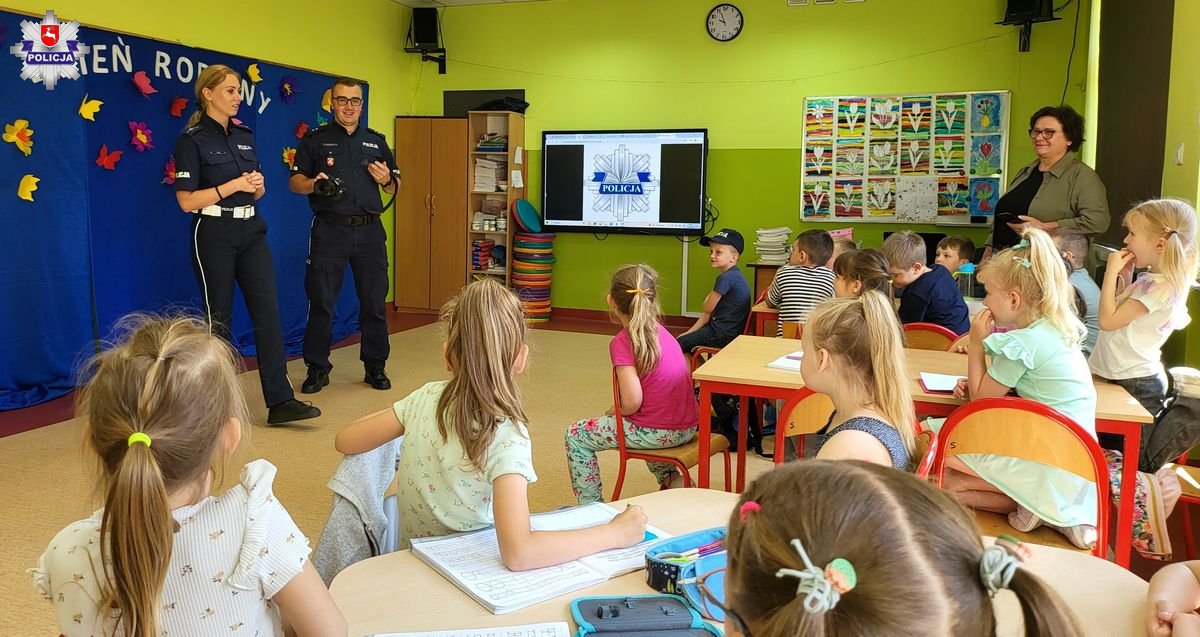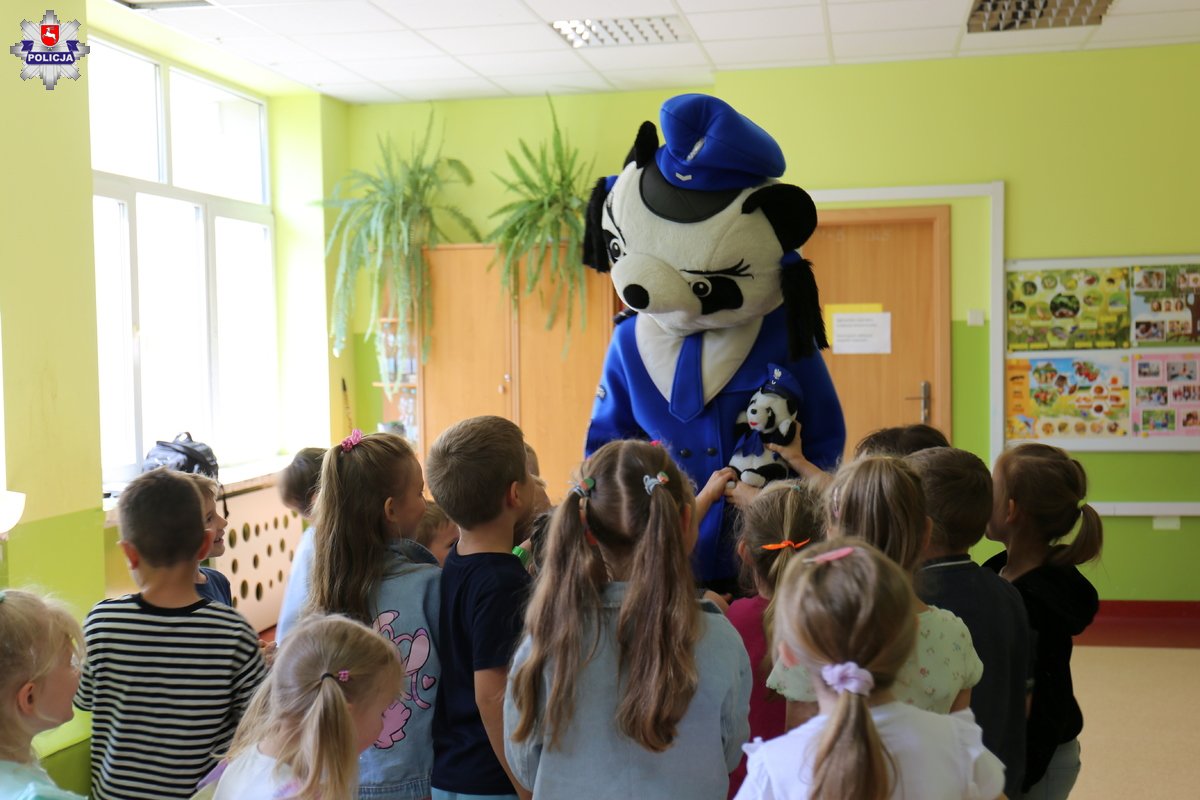 Policjantka z Wydziału Ruchu Drogowego KMP w Lublinie przekazała jak ważne jest prawidłowe poruszanie się po ulicy oraz używanie przez pieszych elementów odblaskowych. Każde dziecko otrzymało opaskę odblaskową. Przypomniała dzieciom także, jak bezpiecznie poruszać się w drodze do szkoły. Wspólnie z małymi uczniami zainscenizowała prawidłowy sposób przechodzenia przez jezdnię. Maluchy wykazały się dużą wiedzą na temat bezpieczeństwa.
