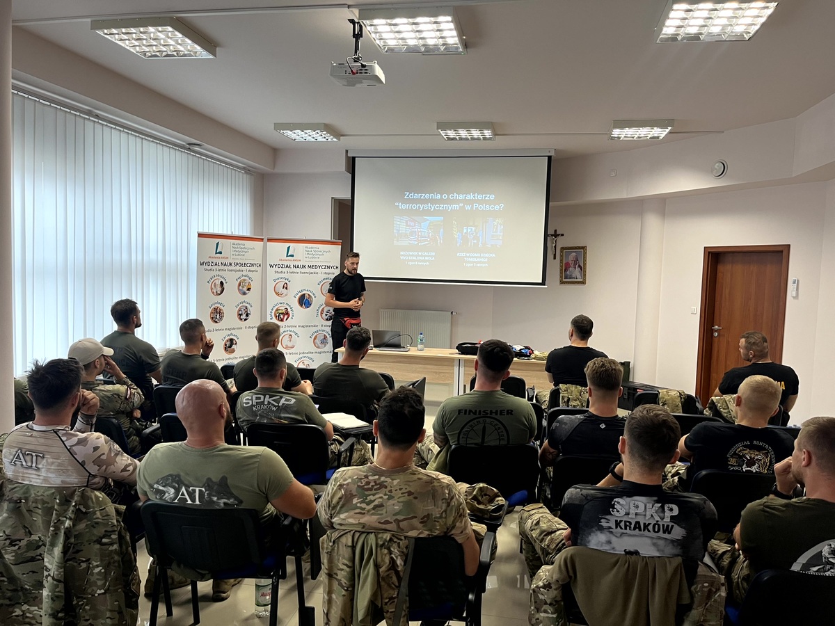Wszystkie te zagadnienia z medycyny ratunkowej z elementami TCCC na początku szkolenia omawiane były podczas wykładu zorganizowanego w siedzibie Akademii Nauk Społecznych i Medycznych w Lublinie. Zajęcia prowadził wykładowca uczelni - ratownik medyczny Maciej Krawiec.