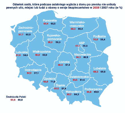 Oceny w województwach rosną lub maleją. W skali kraju o 2 procent zmniejszył się odsetek badanych, którzy często widują patrole, ale o ponad 5 procent wzrosło poczucie bezpieczeństwa. Maleją obawy przed zagrożeniami, z wyjątkiem strachu przed brawurą kierowców, który wciąż rośnie.