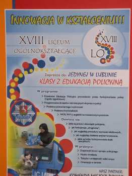 Wczoraj, w ramach programu Otwarte Drzwi Szkoły, Liceum Ogólnokształcące nr XVIII w Lublinie zaprezentowało swoją ofertę programową. Już od września młodzież, która zdecyduje się na naukę w XVIII Liceum będzie mogła uczęszczać do klas o profilu policyjnym. Wczoraj, w ramach programu Otwarte Drzwi Szkoły, Liceum Ogólnokształcące nr XVIII w Lublinie zaprezentowało swoją ofertę programową. Już od września młodzież, która zdecyduje się na naukę w XVIII Liceum będzie mogła uczęszczać do klas o profilu policyjnym. Wybierając ten profil młodzi ludzie poznawać będą podstawy prawa i wiedzy policyjnej, będą zapoznawać się ze specyfiką pracy policjanta i wyzwaniami, jakiej niesie służba w Policji. W trakcie spotkania młodzi ludzie byli bardzo zainteresowani specyfiką służby w Policji. Padały pytania dotyczące prowadzonych przez Policję akcji, współdziałania w poszczególnych pionach oraz struktury organizacyjnej służb mundurowych. Młodzież żywo reagowała na opowiadania policjantów. Wśród chętnych do klasy z Edukacją Policyjną było wiele młodych dziewcząt.
