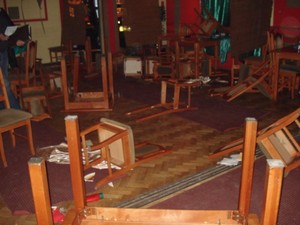 Po wizycie awanturników wnętrze lokalu wyglądało jak pobojowisko. Właściciel oszacował wstępnie straty na kwotę co najmniej 3 tys. zł.
