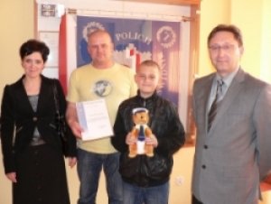 Podczas wczorajszego spotkania 11-letni Bartek otrzymał od komendanta świdnickiej policji m.in. pamiątkowego susła maskotkę policyjną. Jego rodzice usłyszeli z odebrali gratulacje i podziękowanie za właściwe wychowanie syna, wpajanie zasad współżycia społecznego oraz wyczulenie dziecka na dobro innych. Jak podkreślił Komendant 11 letni Bartek zasługuje na miano prawego obywatela, a swoją postawą daje przykład uczciwości i życzliwości w czasach, w których niekiedy brak takich cech u innych ludzi.