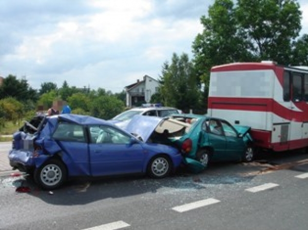 Kierujący samochodem toyota corolla jadąc za autobusem nie zdążył zahamować i uderzył w tył jelcza. Na rozbitą toyotę najechał samochód osobowy audi, który z kolei został uderzony w tył przez jadący samochód ciężarowy mercedes.