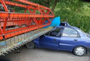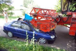 Kierujący lanosem wjechał pod nadjeżdżający z przeciwka kombajn. Na wąskiej drodze nie miał szans wyminięcia maszyny. Na szczęście kierowca samochodu nie odniósł poważnych obrażeń. Operator kombajnu został ukarany mandatem karnym.