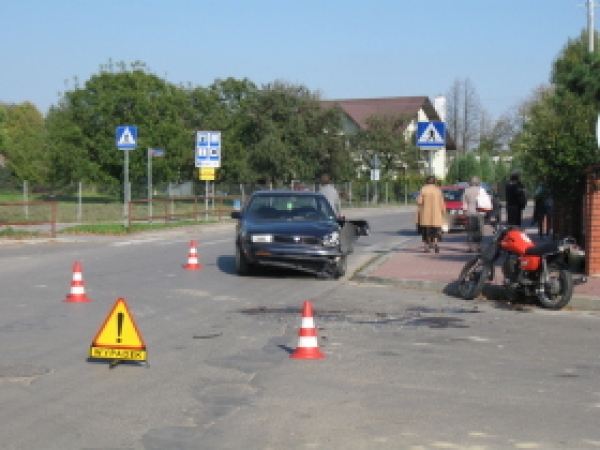 Jak ustalili policjanci, 21 letnia kobieta kierując samochodem marki Nissan na skrzyżowaniu skręcając w lewo nie ustąpiła pierwszeństwa przejazdu jadącemu z naprzeciwka motocyklem 18 letniemu mieszkańcowi gm. Komarówka doprowadzając do zderzenia. Kierujący jednośladem z obrażeniami ciała został przewieziony do szpitala. Policjanci sprawdzili stan trzeźwości kierujących, obydwoje byli trzeźwi.