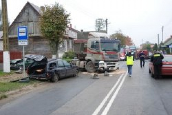 Wczoraj w Świeciechowie gm. Annopol na trasie Annopol- Opole Lubelskie doszło do wypadku drogowego. Kierujący towarowym fiatem ducato przewożącym materiały budowlane wyprzedzał w niedozwolonym miejscu. Doszło do zderzenia z samochodem ciężarowym. Kierowca ciężarówki usiłował uniknąć zderzenia zjeżdżając na prawe pobocze. Niestety bus uderzył w ciężarówkę uszkadzając zawieszenie i układ kierowniczy. Niesterowna ciężarówka uderzyła w schody budynku mieszkalnego oraz dwa pojazdy stojące na poboczu.