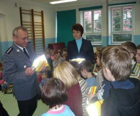 Kamizelka albo opaska odblaskowa znacznie zwiększają bezpieczeństwo pieszych na drodze - szczególnie o tej porze roku, gdy szybciej zapada zmierzch. W nocy i o zmroku, na drogach źle oświetlonych lub nieoświetlonych trudno dostrzec pieszego, dlatego niezwykle ważne jest aby piesi, a w szczególności dzieci poruszające się jezdnią lub poboczem nosili elementy odblaskowe. W dzisiejszym spotkaniu uczestniczyło blisko 100 uczniów z najmłodszych klas.