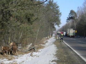 Dzisiaj o godzinie 10:30 w Tchórzewie na drodze K-19 doszło do zderzenia samochodu Ford z zaprzęgiem konnym. Jak ustalili policjanci, kierujący samochodem 22 - letni mieszkaniec Radzynia jadąc w kierunku Kocka najechał na tył zaprzęgu konnego, którym kierował 64 letni mieszkaniec gm. Borki. Wóz rozpadł się na kilka części. Wystraszone konie zatrzymały się prawie 200 metrów dalej.