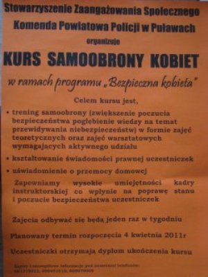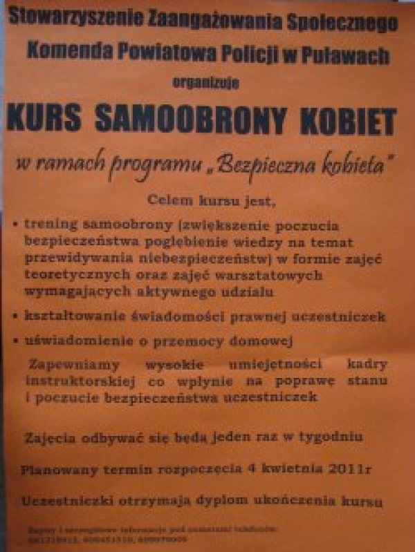 Program ten został zorganizowany przy współpracy Komendy Powiatowej Policji w Puławach i Stowarzyszenia Zaangażowania Społecznego. Ma on na celu zwiększenie poczucia bezpieczeństwa, kształtowania świadomości prawnej wśród kobiet oraz poprawienia ich sprawności fizycznej i umiejętności zachowania się w sytuacjach niebezpiecznych. Szkolenie to będzie obejmowało wykłady oraz zajęcia warsztatowe z zakresu psychologii, prewencji, prawa i technik samoobrony. W zajęciach będzie mogło wziąć udział 20 kobiet. Uczestniczki otrzymają dyplom ukończenia kursu. Poprzednie edycje kursu cieszyły się ogromnym zainteresowaniem. Zachęcamy do udziału w tym przedsięwzięciu.