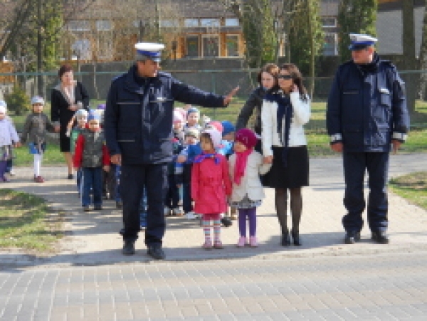 Po części teoretycznej policjanci wraz z przedszkolakami i opiekunami udali się na przejście dla pieszych gdzie w sposób praktyczny zaprezentowano nabyte umiejętności.