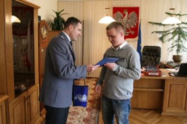 Dzisiaj Lubelski Komendant Wojewódzki Policji podziękował 19-letniemu maturzyście z Lublina za godną naśladowania postawę. Komendant podkreślił, że dzięki takim właśnie zachowaniom wspólnie możemy przyczynić się do tego, by w okolicy naszego miejsca zamieszkania było bezpiecznie, nie robiąc zaś nic dajemy społeczne przyzwolenie dla przestępczej działalności. Dodał również, że zachowanie Pana Mateusza powinno być wzorem dla innych, aby nie przechodzili obojętnie obok problemu, lecz reagowali na przestępstwa, których są świadkami. Lubelski Komendant Wojewódzki oprócz podziękowań ofiarował Panu Mateuszowi również pamiątkowy grawer z logo Komendy Wojewódzkiej Policji w Lublinie.
