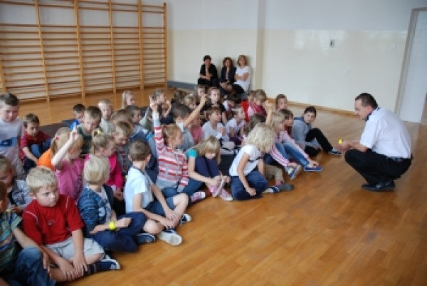Podczas spotkania z pierwszakami w Zespole Szkół Ogólnokształcących Nr 2. im. Jana Pawła II.