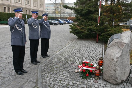 Lubelski Komendant Wojewódzki insp. Dariusz Działo w towarzystwie przedstawicieli Związków Zawodowych Policjantów złożyli dzisiaj również wiązankę kwiatów przy Tablicy Poświęconej Pomordowanym Policjantom II RP.