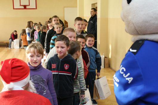 Mikołaj w asyście policyjnej maskotki – sierż. Poli zagościli w Szkole w Warszawiakach. Towarzyszyli im policjanci z Wydziału Prewencji KMP w Lublinie, komendant Komisariatu Policji w Bełżycach, dzielnicowy oraz przedstawiciele TV Lublin. Przyjazd niespodziewanych gości wzbudził radość uczniów.