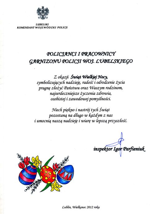Życzenia od Lubelskego Komendanta Wojewódzkiego Policji Data publikacji 05.04.2012 Powrót Drukuj Z okazji Świąt Wielkiej Nocy...