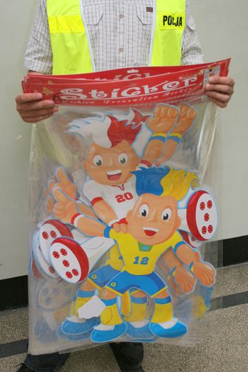 Policjanci zwalczający przestępczość gospodarczą KWP w Lublinie wspólnie z funkcjonariuszami z I Komisariatu Policji ujawnili i przerwali nielegalną sprzedaż wyrobów oznaczonych zastrzeżonymi znakami graficznymi Turnieju Finałowego Mistrzostw Europy w Piłce Nożnej UEFA EURO 2012. Zabezpieczono 140 sztuk naklejek ze znakami graficznymi UEFA EURO 2012 w postaci maskotek SLAVKO i SLAVEK. Ustalono organizatora tego nielegalnego procederu. Okazał się nim obywatel Chin 40 letni właściciel firmy handlowej.