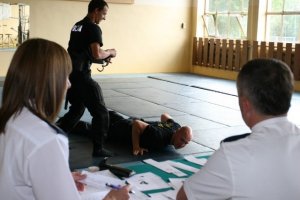 W tym samym czasie inna para wykazywała się umiejętnościami stosowania technik obezwładniania przy wykorzystaniu środków przymusu bezpośredniego: policyjnej tonfy, czy kajdanek. Uwalnianie się z uchwytu oburącz, uwalnianie głowy z uchwytu, obrona przed nożem, kopnięciem, czy ciosem pięścią to tylko niektóre założenia zadań. Maksymalną liczbę punktów, jaką mogli uzyskać policjanci to 20. Ci, którzy mają do nadrobienia straty, muszą wykazać się jutro i w piątek. W czwartek mundurowi zmierzą się na strzelnicy oraz na „policyjnym miasteczku” gdzie przeprowadzą symulowane interwencje. W piątek, ostatni dzień zawodów, czeka ich tor przeszkód.