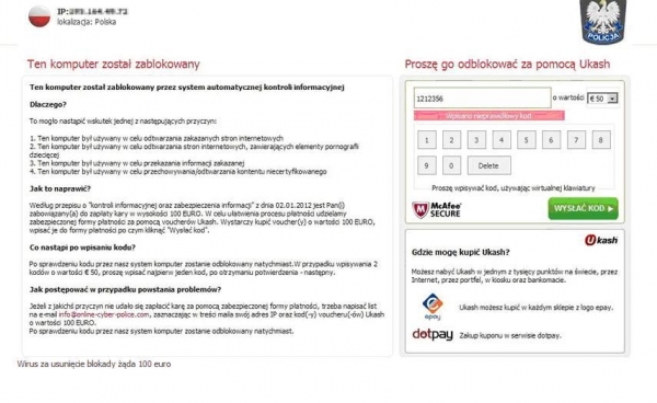 Polskich internautów od kilku miesięcy atakuje wirus Weelsof. Co więcej - jego twórcy podszywają się pod Policję i żądają wpłaty określonej kwoty pieniędzy w zamian za usunięcie blokady. Aby nie stać się ofiarą hakerów, pamiętajmy o korzystaniu z legalnych i aktualizowanych oprogramować antywirusowych.