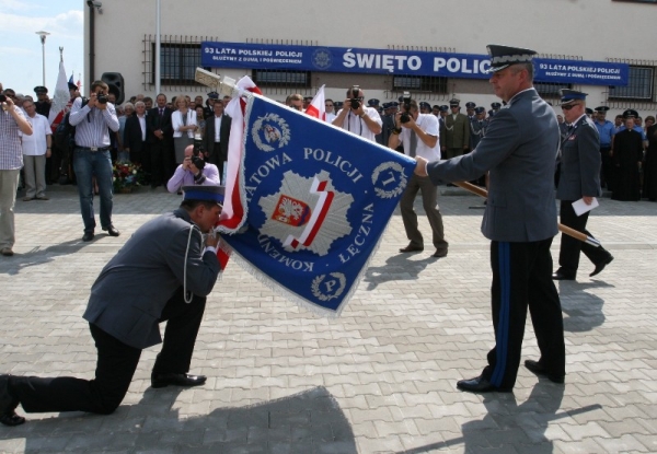 Podczas dzisiejszych obchodów 93-lecia powstania Policji Komenda Powiatowa Policji w Łęcznej otrzymała sztandar. Z rąk Komendanta Głównego Policji – nadinsp. Marka Działoszyńskiego sztandar odebrał z zachowaniem ceremoniału Komendant Powiatowy Policji w Łęcznej insp. Sławomir Zagojski.