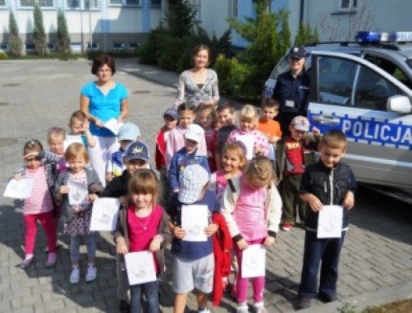 Wielką radość maluchom sprawiło również oglądanie wyposażenia policyjnego radiowozu oraz włączanie sygnałów dźwiękowych. Maluchy zobaczyły także psy służbowe przebywające w specjalnie przygotowanych dla nich wybiegach. Na zakończenie spotkania przypomniano milusińskim o podstawowych zasadach bezpieczeństwa w domu, na drodze oraz o prawidłowym zgłaszaniu pomocy przez telefon. Dzieci okazując swoją wdzięczność i zadowolenie z wycieczki ofiarowały policjantom pięknie wykonany przez siebie kwiatek.