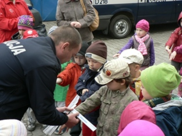 Obok zwiedzania nie zabrakło pogadanki o bezpiecznym poruszaniu się po drodze, szczególnie w okresie jesiennym, kiedy to wcześniej zapada zmrok i jest ograniczona widoczność. By milusińscy byli widoczni, a tym samym bezpieczni na drodze, policjanci rozdali im elementy odblaskowe. Dzieciaki zobowiązały się do ich noszenia. Nie zabrakło pamiątkowych zdjęć na tle policyjnego radiowozu.