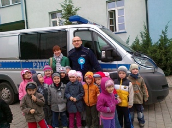 Wielką radość maluchom sprawiło również oglądanie policyjnego radiowozu i włączanie sygnałów. Zwiedzający zobaczyli także psy służbowe przebywające w specjalnie przygotowanych dla nich wybiegach. Na zakończenie spotkania przypomniano milusińskim o podstawowych zasadach bezpieczeństwa w domu, na drodze oraz o prawidłowym zgłaszaniu pomocy przez telefon. Na zakończenie wizyty dzieci okazując swoją wdzięczność i zadowolenie z wycieczki ofiarowały policjantom własnoręcznie wykonany order ,,Super Policjant”.