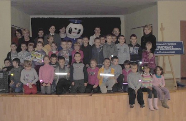 Dzieci dostały opaski odblaskowe na rękę oraz naklejki odblaskowe na rower, które ufundowało Stowarzyszenie Bezpieczny Powiat Hrubieszowski. Pan Prezes Stowarzyszenia Zdzisław Kossakowski rozdał także dzieciom słodkości. Na koniec maluchy mogły z bliska pooglądać policyjny radiowóz, sprzęty policyjne, takie jak pałka, kajdanki.