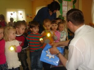 We wtorek lubartowscy policjanci zawitali do Przedszkola „Fantazja”w Lubartowie. Celem spotkania było wyjaśnienie dzieciom jak bezpiecznie dotrzeć do przedszkola, w jaki sposób przechodzić przez jezdnię, ale także jak bawić się bezpiecznie w domu, przedszkolu czy na placu zabaw. Funkcjonariusze przypomnieli także jak ważne jest to, aby każde dziecko jeździło w foteliku samochodowym. Najmłodsi zapoznali się również ze sprzętem policyjnym i bardzo chętnie brali udział w jego prezentacji. Nie zabrakło przymierzania policyjnej czapki, kamizelki kuloodpornej czy też machania policyjnym „lizakiem”. Na koniec na najmłodszych czekała niespodzianka. Dzięki uprzejmości firmy PZU i Burmistrza Miasta Lubartów każde dziecko dostało odblaskowy gadżet poprawiający widoczność pieszego na drodze. Dzieci z entuzjazmem przyjęły prezent i zapewniły, że będą go używać.