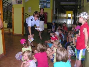 Grupę kolonistów ze Szkoły Podstawowej Nr 4 w Krasnymstawie odwiedzili dzisiaj krasnostawscy policjanci. Mundurowi przybliżyli dzieciom problematykę bezpiecznego wypoczynku zarówno nad wodą jak i w domu. Zapoznali z niebezpieczeństwami jakie mogą je spotkać podczas zabaw w miejscu zamieszkania czy podczas prac polowych. Omówili kwestię bezpiecznego poruszania się po drodze oraz scharakteryzowali zagrożenia czyhające na młodych ludzi podczas wakacji. Pani policjant opowiadała jak ustrzec się przed różnego rodzaju niebezpieczeństwami. Co zrobić, gdy zaczepi ich obca osoba, ktoś niepożądany zechce wejść do domu, czy też zaatakuje ich pies. Spotkanie odbyło się przy współudziale przedstawicielki miejscowej Stacji Sanitarno-Epidemiologicznej.