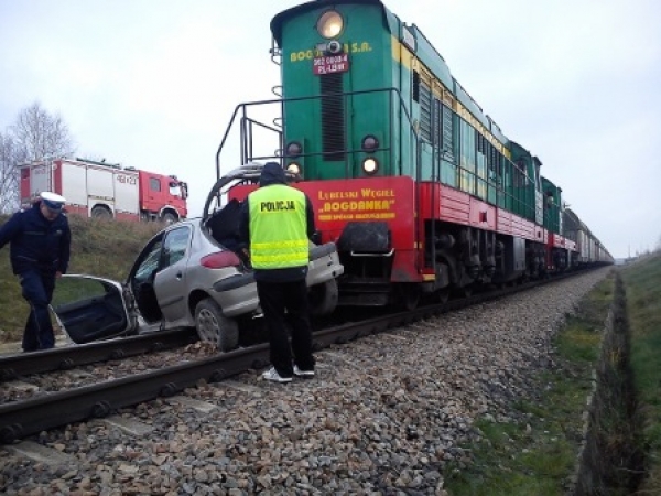 Dzisiaj przed godziną 8.00 dyżurny łęczyńskich policjantów otrzymał zgłoszenie o zdarzeniu na niestrzeżonym przejeździe kolejowym w miejscowości Białka. Ze wstępnych ustaleń policjantów wynika, że kierująca samochodem osobowym marki Peugeot wjechała pod nadjeżdżającą lokomotywę z 40 wagonami z ładunkiem. Skład ciągnął samochód po torach przez około 300 - 400 metrów.