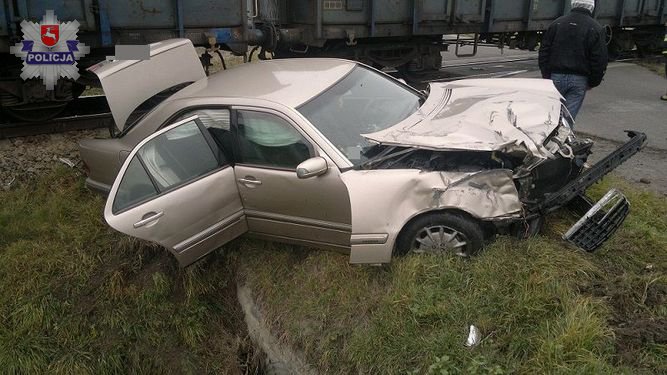 Dzisiaj po godzinie 8.00 dyżurny łęczyńskich policjantów otrzymał zgłoszenie o zdarzeniu drogowym w miejscowości Zawadów gm. Puchaczów. Ze wstępnych ustaleń policjantów wynika, że kierujący samochodem osobowym marki Mercedes nie zastosował się do znaku STOP na niestrzeżonym przejeździe kolejowym i doprowadził do zderzenia z nadjeżdżającą lokomotywę z 40 wagonami z ładunkiem.