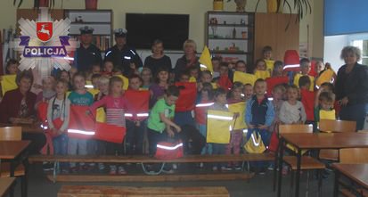 Dzieci uważnie słuchały rad policjanta oraz wykazały się dużą wiedzą odpowiadając na zadawane pytania. Troska o bezpieczeństwo dzieci – to jeden z priorytetów działania policjantów. Mundurowi liczą na to, że ich rady na długo pozostaną w pamięci najmłodszych. Na zakończenie funkcjonariusze wręczyli upominki posiadające elementy odblaskowe.