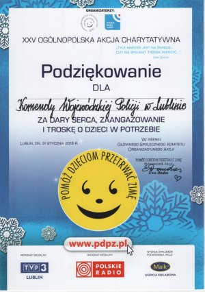 „Za Dary Serca, Zaangażowanie i Troskę o Dzieci w Potrzebie” To podziękowania jakie otrzymali policjanci za udział w akcji „Pomóż Dzieciom Przetrwać Zimę”. Coroczna uliczna zbiórka prowadzona jest z myślą o dzieciach z rodzin wielodzietnych, niepełnych, rozbitych, będących w trudnej sytuacji materialnej. Policjanci dbali o bezpieczeństwo wolontariuszy.