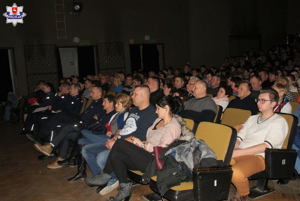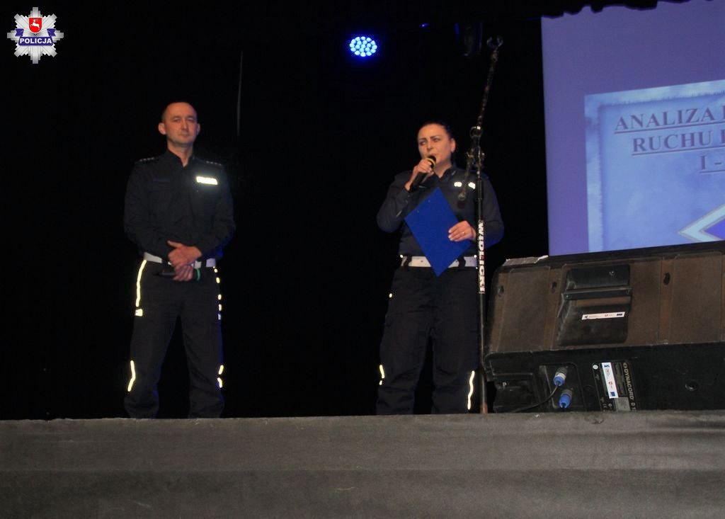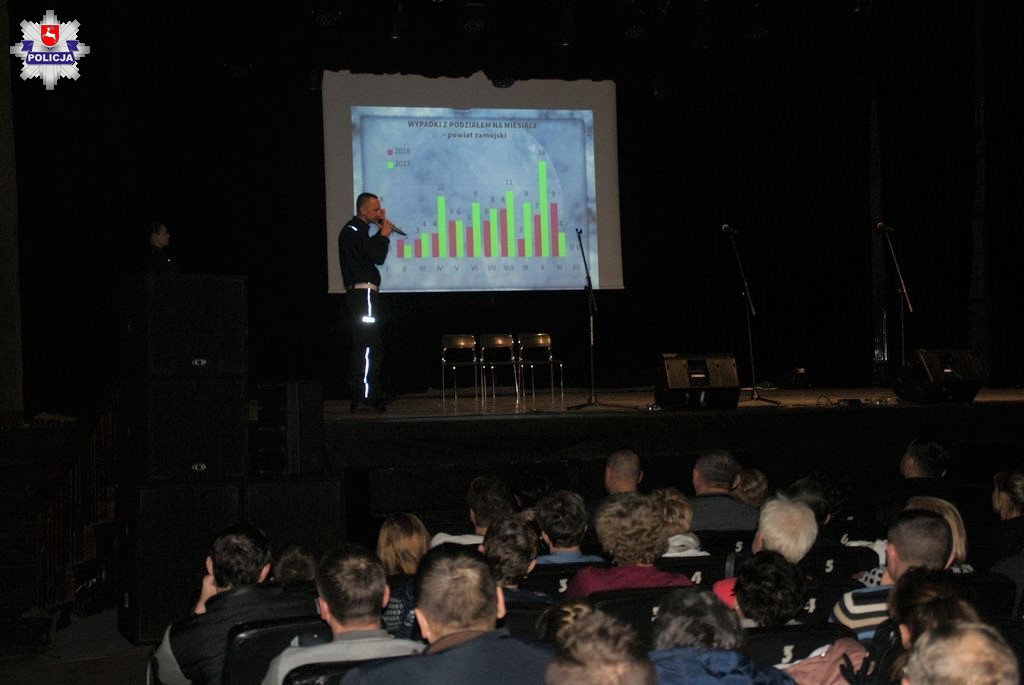 Wczoraj po raz kolejny w Zamojskim Domu Kultury odbyło się seminarium poświęcone podnoszeniu świadomości społecznej w zakresie bezpieczeństwa na drogach. Licznie zgromadzonej publiczności, policjanci zaprezentowali zagadnienia związane z bezpieczeństwem ruchu drogowego na terenie Lubelszczyzny. W sposób szczególny zaakcentowano problematykę przyczyn oraz skutków wypadków drogowych oraz zagadnienia związane z bezpieczeństwem niechronionych uczestników ruchu drogowego, a zwłaszcza stosowania odblasków. Na zakończenie uczestnicy seminarium bawili się słuchając występu kabaretu „pod Wyrwigroszem”.