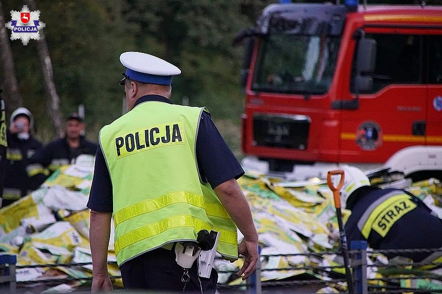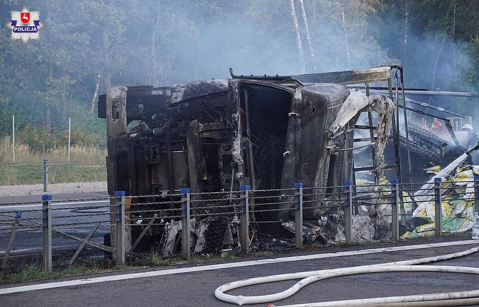 Do tego zdarzenia doszło wczoraj przed godz. 18 w rejonie Zemborzyc Tereszyńskich. Kierujący zestawem pojazdów marki Daf jadąc drogą S-19 od strony Trojaczkowic w kierunku Lublina zjechał nagle na pas zieleni, po czym wywrócił się. Pojazd stanął w płomieniach.